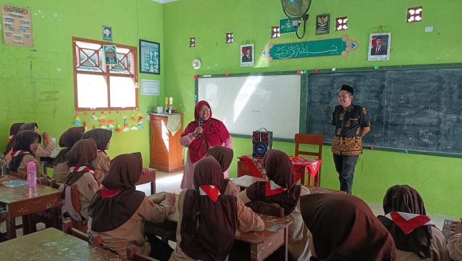 Komisioner KPU Kabupaten Pekalongan, Dika Redana dan Kasubbag Parmas dan SDM, Endang Tris Lasmini saat memberikan materi kepada para pelajar dalam program “KPU Mengajar” di MTs Salafiyah Wonoyoso, Buaran, Sabtu (11/4/2026 – dok. Istimewa)